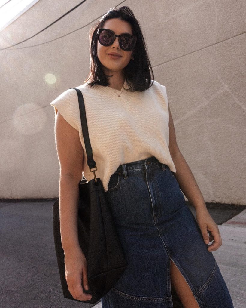For a casual yet stylish weekend outfit, combine a black denim skirt with a pink knitted top. This look is breezy, easy to put together, and great for daytime hangouts or errands. I love pairing this with white sneakers and a simple crossbody bag. If the weather cools down, throw on a cropped black denim jacket. Add a headband or sunglasses for a playful vibe. It’s youthful, timeless, and always flattering.