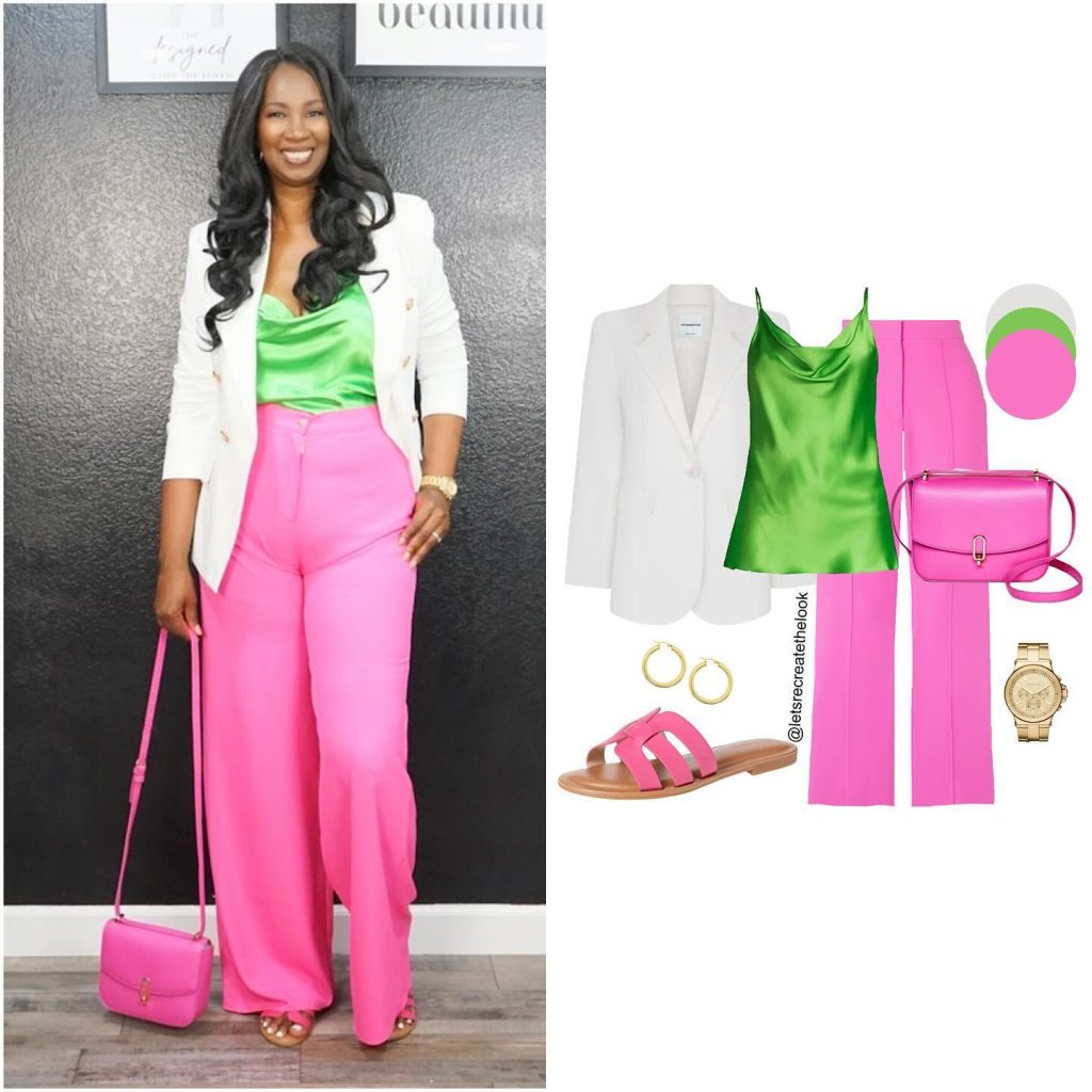 Silky meets sultry with this bold yet elegant outfit. A pink satin blouse, especially one with balloon sleeves or a bow tie neck, elevates black leather pants in the best way. It’s a look that commands attention without trying too hard. Perfect for dinner dates or cocktail hours, this outfit works best with heeled sandals or booties. Add gold or rose gold jewelry to tie it all together. Trust me—this outfit will have you feeling like a million bucks.