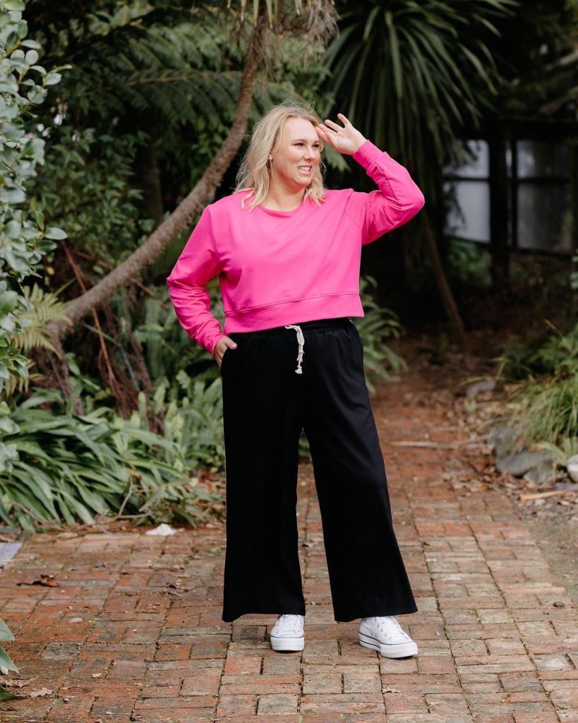 3. Black Wide-Leg Pants with a Soft Pink Sweater
