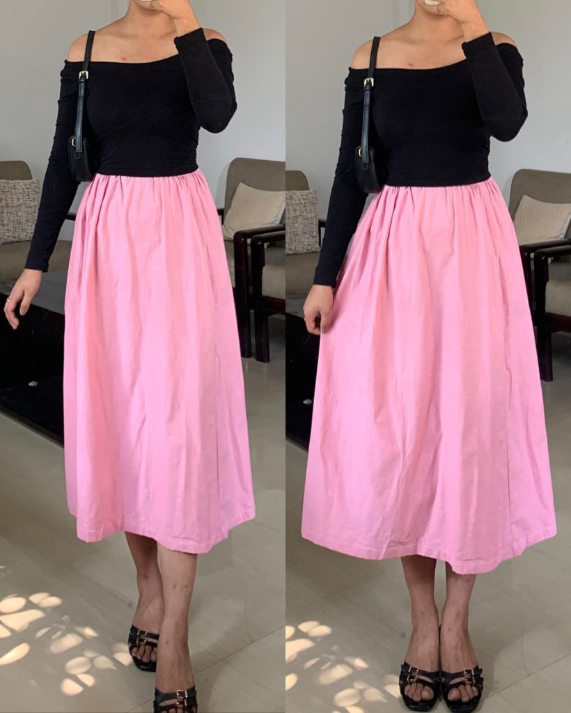 A little rebellion never hurt anyone—especially in fashion. A flirty pink midi skirt combined with a black graphic tee is one of my favorite “cool girl” looks. It walks the line between feminine and street-style. Knot the tee at the waist for a laid-back feel, and opt for combat boots or chunky sneakers to complete the vibe. A leather crossbody and oversized sunglasses will make this outfit Instagram-ready in seconds. It’s youthful, fun, and full of attitude.