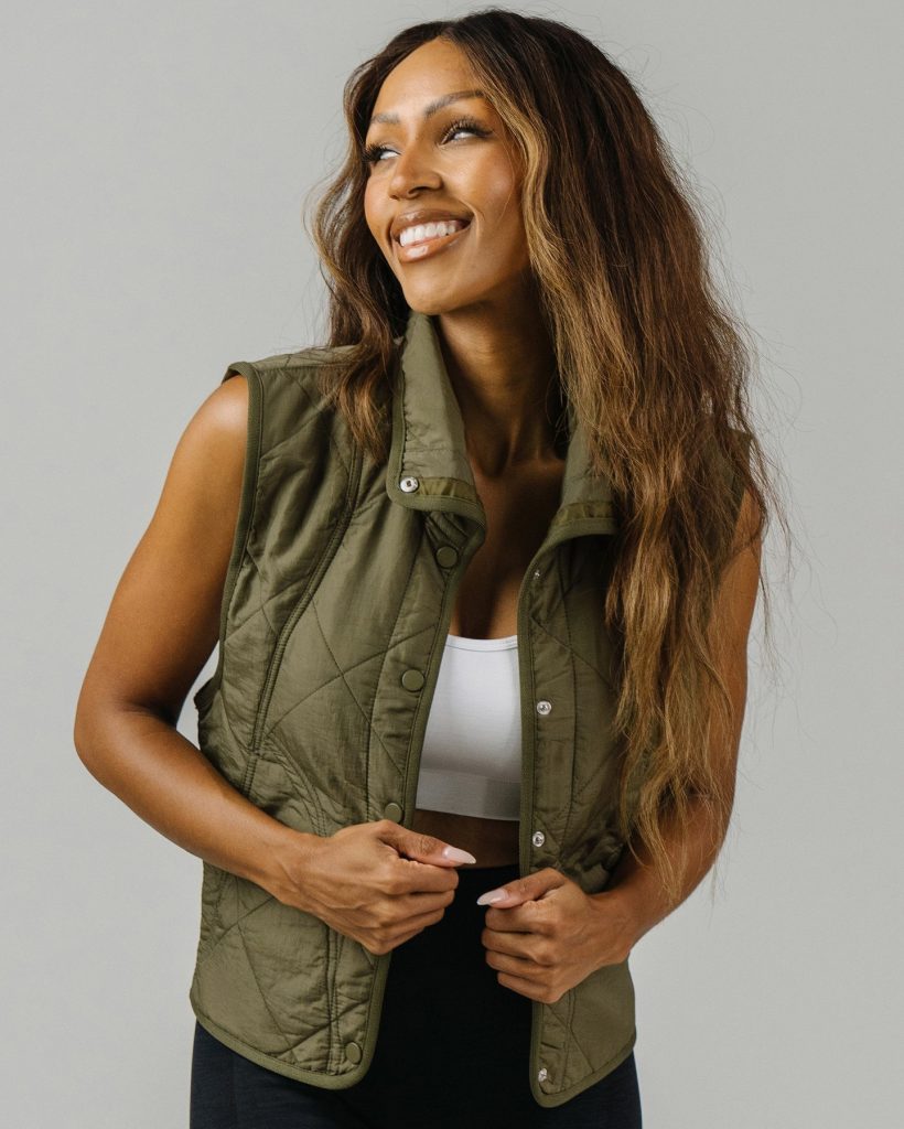 15. Dark Green Quilted Vest Layered Over Athleisure