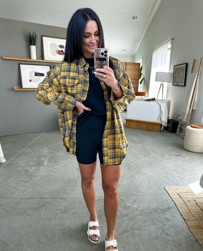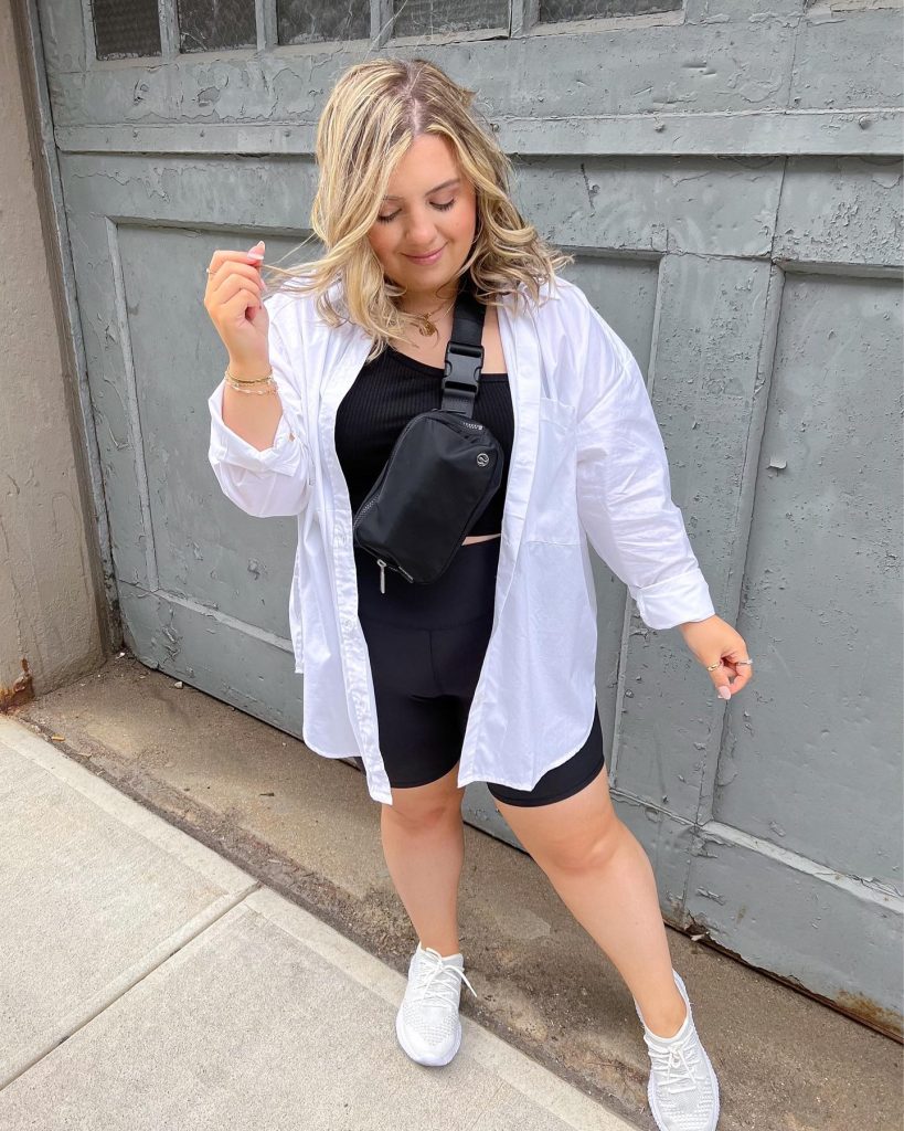 The oversized button-down paired with biker shorts is a perfect combo of casual and chic. This look is lightweight, breathable, and effortlessly cool—ideal for summer days when you want to stay stylish without trying too hard. Choose a crisp white button-down or go bold with a striped or patterned version. Pair it with high-rise black biker shorts for a sporty touch that keeps the silhouette relaxed and tomboyish. Add white sneakers and a canvas crossbody bag to finish the look. This outfit is great for brunch dates, dog walks, or weekend errands.