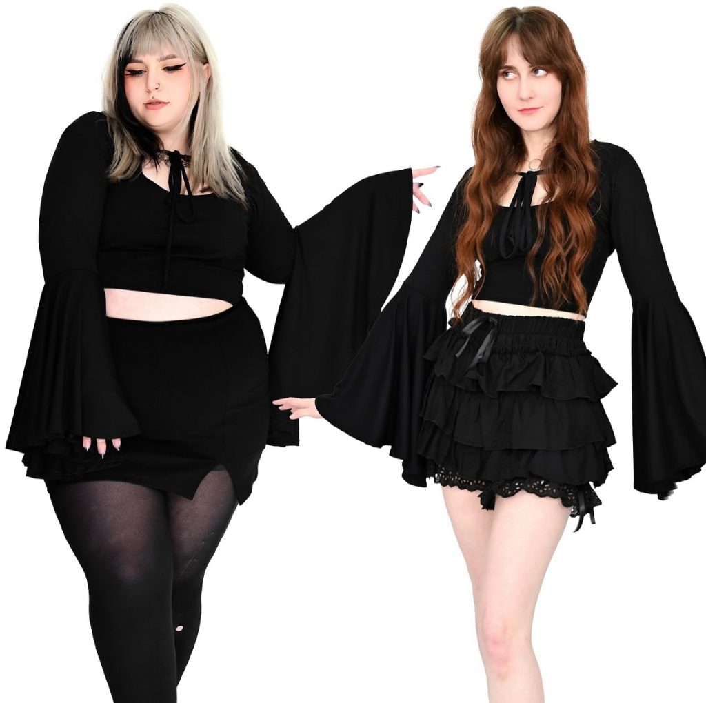 Channel dark fae energy with a mesh bell sleeve crop top paired with high-waisted black shorts. The sheer material provides airiness, while the dramatic sleeves make a bold visual statement. It’s ideal for summer festivals, casual night outs, or just expressing your alternative side while staying cool. The contrast of soft fabric with structured shorts adds dimension and attitude. This set works great with combat boots or strappy sandals, offering versatility in styling. If gifting, it’s a great pick for teens and twenty-somethings who love combining modern streetwear with gothic nostalgia. Pair it with silver accessories to enhance the mystical vibe.